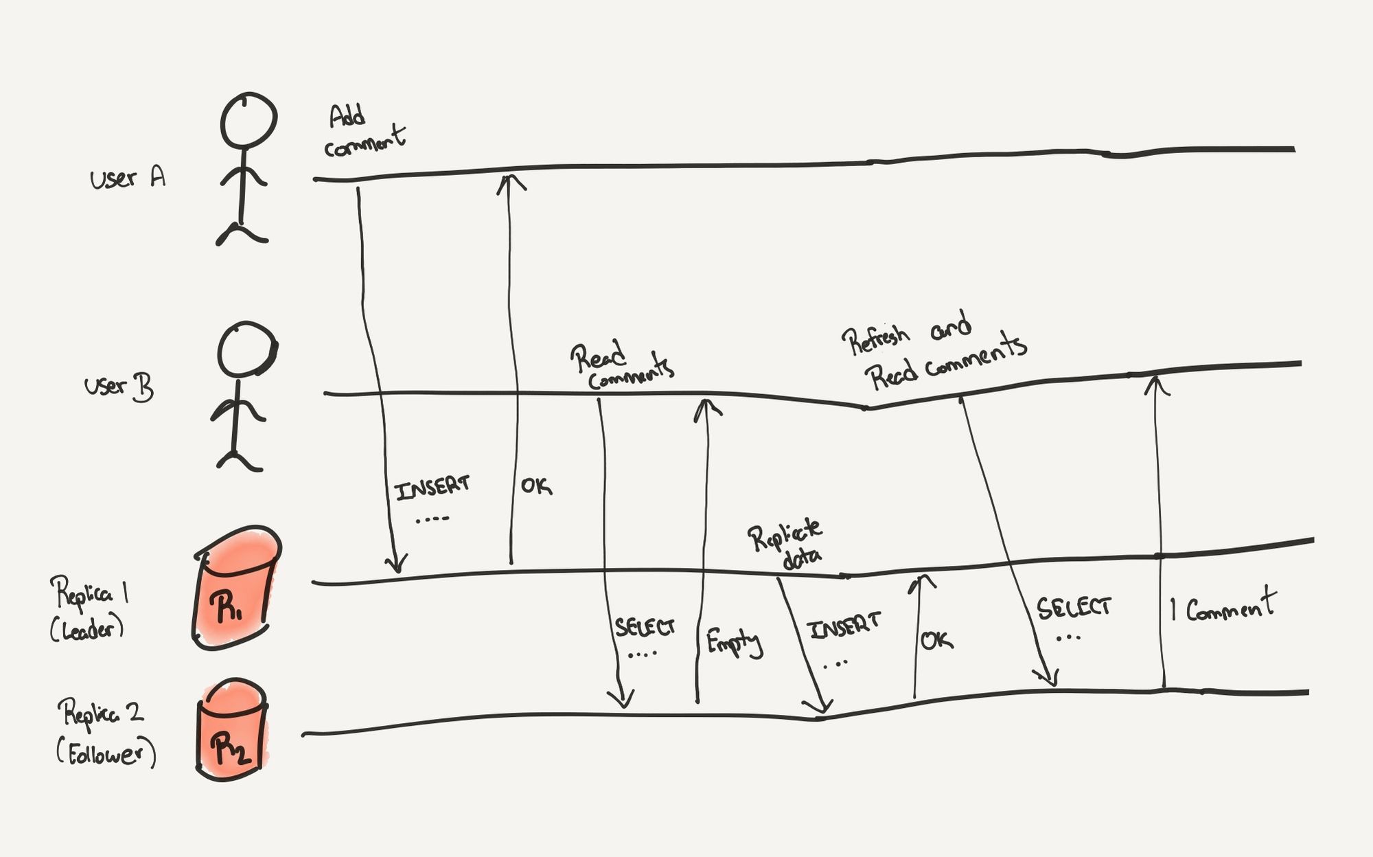 User B shortly requests to look at the comments for the same post. The request is served by the second replica which does not have the new data yet. The response is empty.