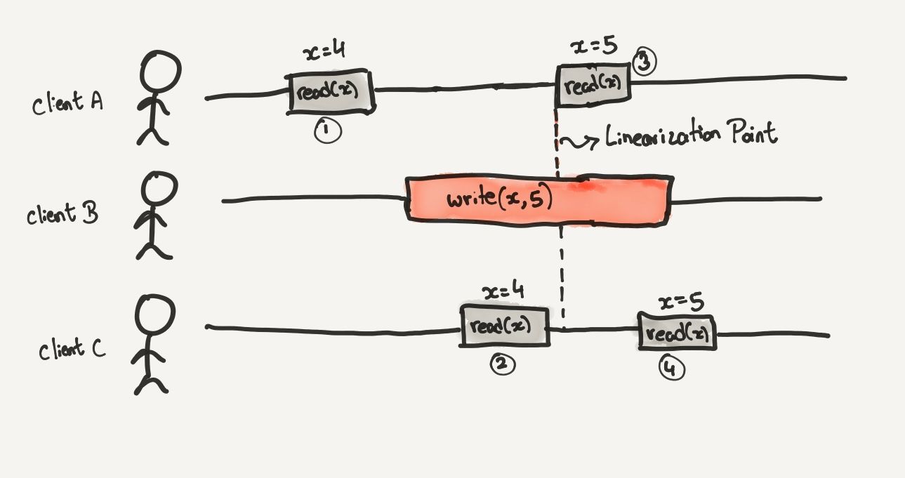 The point at which the value of x flips from 4 to 5 is the linearization point. After the linearization point, all reads must return the newly written value.