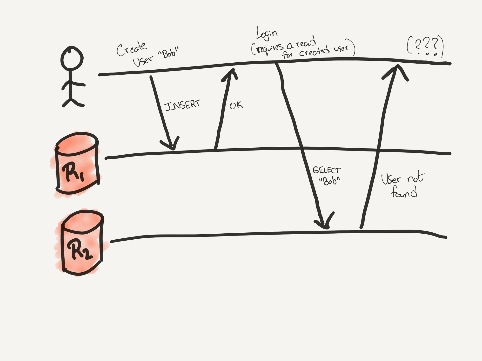 Here is the typical case of a user signing up for your application. The request goes through and the user's details are inserted into replica 1 (R1). Then the user navigates to the login page, enters their credentials, and hits login. This time your application reaches out to replica 2 (R2) to see if the credentials are valid. The user doesn't exist in R2. You end up with a very confused user when they get a user not found message.